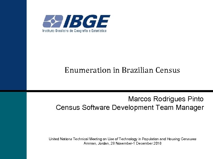 Enumeration in Brazilian Census Marcos Rodrigues Pinto Census Software Development Team Manager United Nations Technical Meeting on Use of Technology in Population and Housing Censuses Amman, Jordan, 28 November-1 December 2016 1