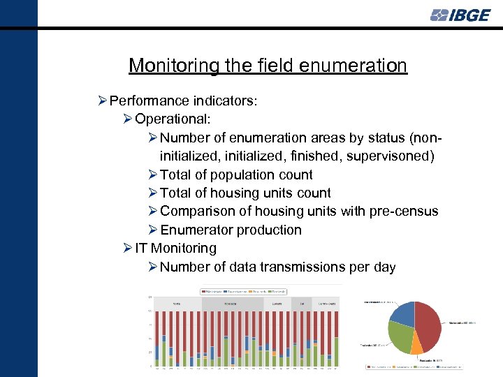 Monitoring the field enumeration Performance indicators: Operational: Number of enumeration areas by status (noninitialized, finished, supervisoned) Total of population count Total of housing units count Comparison of housing units with pre-census Enumerator production IT Monitoring Number of data transmissions per day