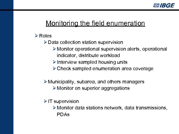 Monitoring the field enumeration Roles Data collection station supervision Monitor operational supervision alerts, operational indicator, distribute workload Interview sampled housing units Check sampled enumeration area coverage Municipality, subarea, and others managers Monitor on superior aggregations IT supervision Monitor data stations network, data transmissions, PDAs