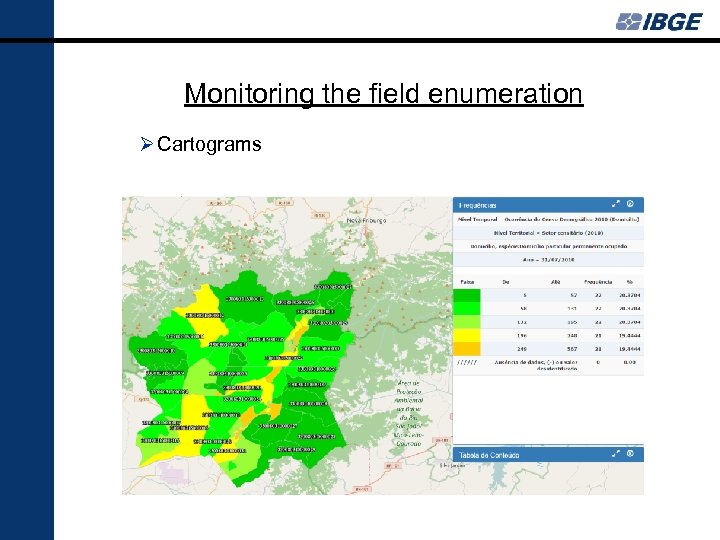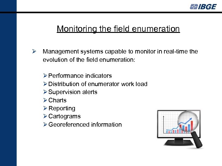 Monitoring the field enumeration Management systems capable to monitor in real-time the evolution of the field enumeration: Performance indicators Distribution of enumerator work load Supervision alerts Charts Reporting Cartograms Georeferenced information