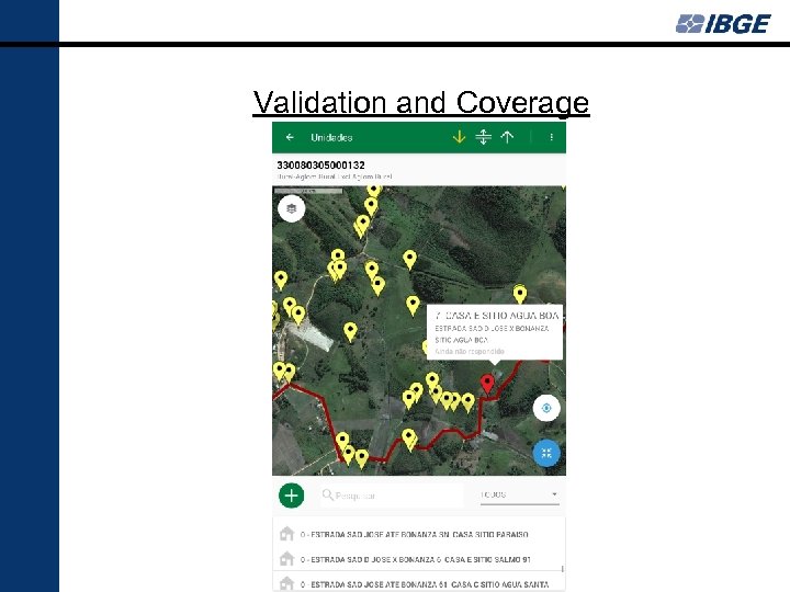 Validation and Coverage Questionnaire with high level of validation and guidance, avoiding many common inconsistencies related to the paper based enumeration Address list updated by pre-census, used for enumerators routing and coverage control Device is equipped with the enumerator area map, questionnaires and list of addresses One enumeration area per enumerator (not shared)