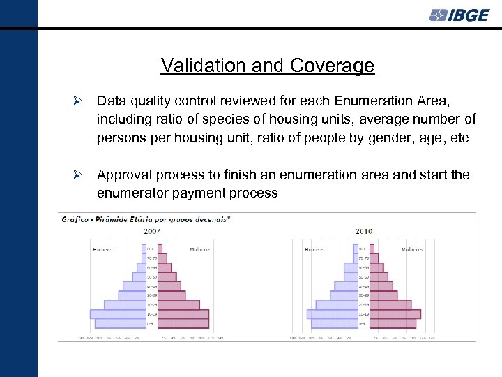 Validation and Coverage Data quality control reviewed for each Enumeration Area, including ratio of species of housing units, average number of persons per housing unit, ratio of people by gender, age, etc Approval process to finish an enumeration area and start the enumerator payment process