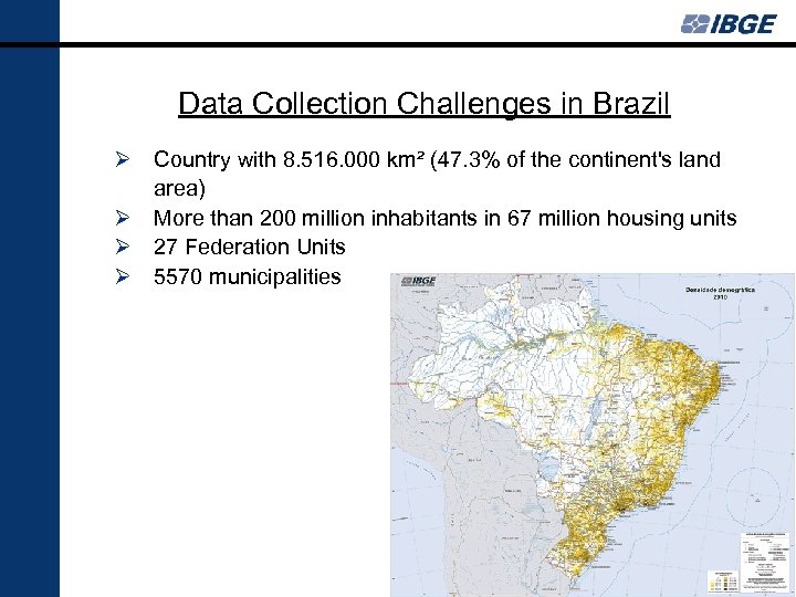 Data Collection Challenges in Brazil Country with 8. 516. 000 km² (47. 3% of the continent's land area) More than 200 million inhabitants in 67 million housing units 27 Federation Units 5570 municipalities 2