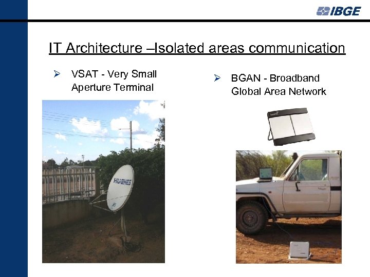 IT Architecture –Isolated areas communication VSAT - Very Small Aperture Terminal BGAN - Broadband Global Area Network 20