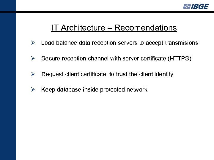 IT Architecture – Recomendations Load balance data reception servers to accept transmisions Secure reception channel with server certificate (HTTPS) Request client certificate, to trust the client identity Keep database inside protected network