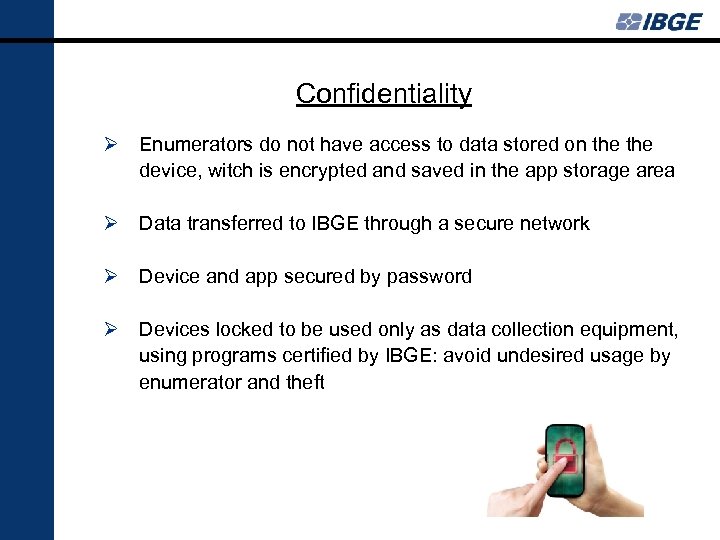 Confidentiality Enumerators do not have access to data stored on the device, witch is encrypted and saved in the app storage area Data transferred to IBGE through a secure network Device and app secured by password Devices locked to be used only as data collection equipment, using programs certified by IBGE: avoid undesired usage by enumerator and theft