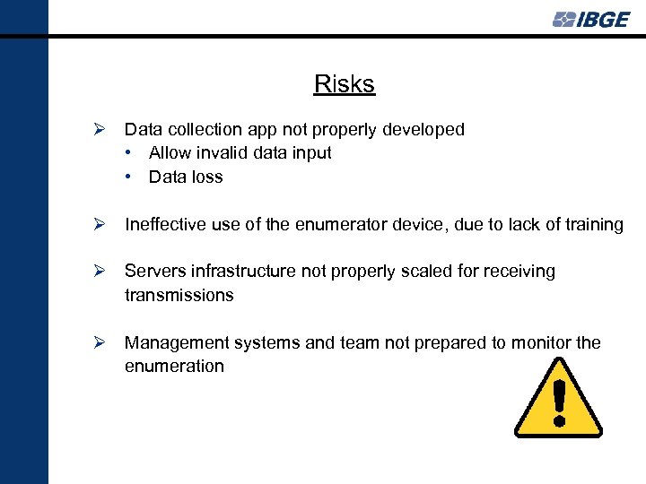 Risks Data collection app not properly developed • Allow invalid data input • Data loss Ineffective use of the enumerator device, due to lack of training Servers infrastructure not properly scaled for receiving transmissions Management systems and team not prepared to monitor the enumeration