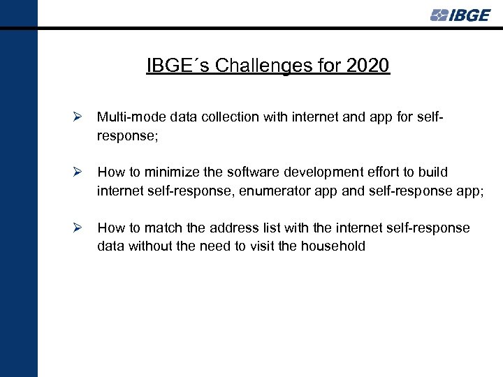 IBGE´s Challenges for 2020 Multi-mode data collection with internet and app for selfresponse; How to minimize the software development effort to build internet self-response, enumerator app and self-response app; How to match the address list with the internet self-response data without the need to visit the household