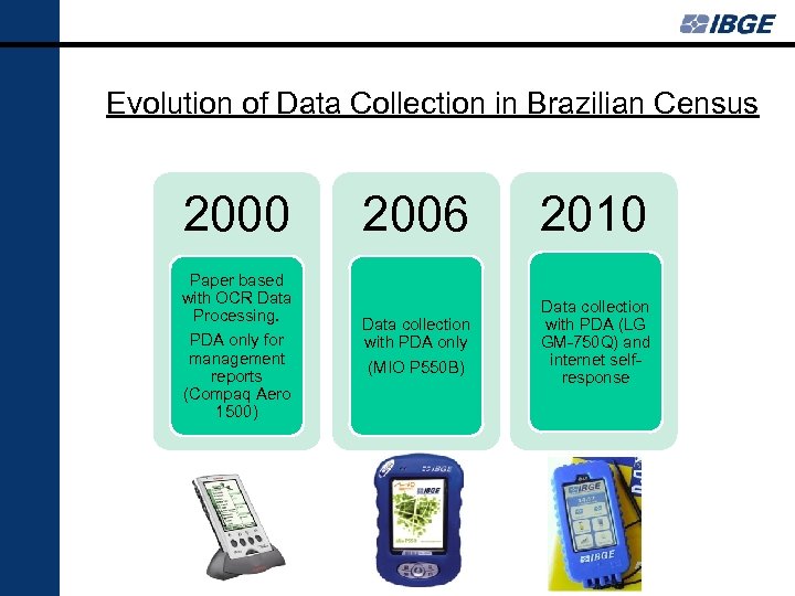 Evolution of Data Collection in Brazilian Census 2000 Paper based with OCR Data Processing. PDA only for management reports (Compaq Aero 1500) 2006 2010 Data collection with PDA only (MIO P 550 B) Data collection with PDA (LG GM-750 Q) and internet selfresponse