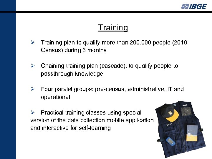 Training plan to qualify more than 200. 000 people (2010 Census) during 6 months Chaining training plan (cascade), to qualify people to passthrough knowledge Four paralel groups: pre-census, administrative, IT and operational Practical training classes using special version of the data collection mobile application, with multimedia and interactive for self-learning 5