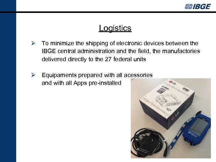 Logistics To minimize the shipping of electronic devices between the IBGE central administration and the field, the manufactories delivered directly to the 27 federal units Equipaments prepared with all acessories and with all Apps pre-installed