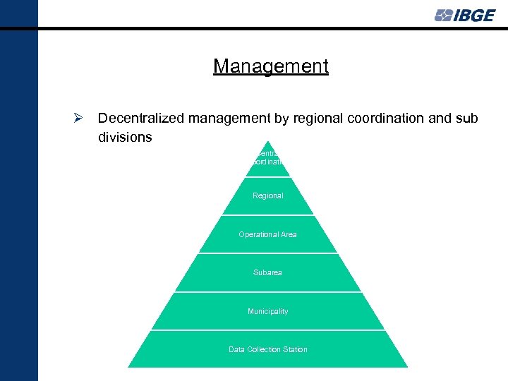 Management Decentralized management by regional coordination and sub divisions Central Coordination Regional Operational Area Subarea Municipality Data Collection Station