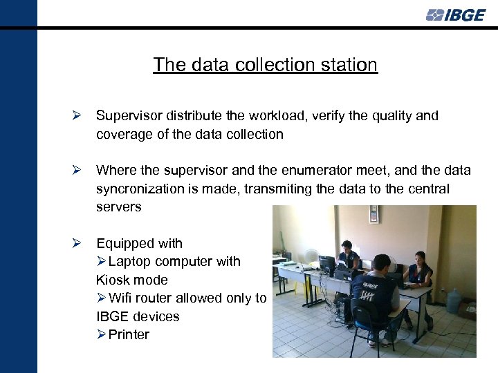 The data collection station Supervisor distribute the workload, verify the quality and coverage of the data collection Where the supervisor and the enumerator meet, and the data syncronization is made, transmiting the data to the central servers Equipped with Laptop computer with Kiosk mode Wifi router allowed only to IBGE devices Printer 8