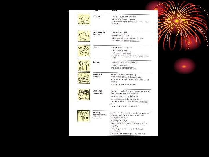 • The comparison between different environments both in the past and the present. • Environmental issues such as: (i) The greenhouse effect. (ii) Acid rain and (iii) Air pollution. • Local, national and international legislative controls to protect and manage the environment; • How policies and decisions are made about the environment. • How human live and livelihoods are dependent on the environment. • The conflicts which can arise about environmental issues like river water sharing. • How the environment has been effected the past decisions and actions. • The importance of planning and design and esthetic considerations. • The importance of effective action to protect and manage the environment.
