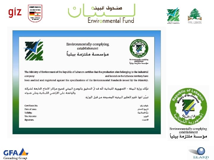 How to apply for a Compliance Certificate Categories – Existing Industrial Establishments, operating but not licensed – Existing Industrial establishments, operating, and having a construction permit (w/o operation permit) – Existing Industrial establishments, operating, and having an operation permit Procedures – Prepare a detailed Environmental Audit and submit to MOE – Implement the Environmental Management Plan indicated in the Audit Report – Apply for Certification from MOE – Correct the legal status of the establishment and get the needed permits – MOE to respond accordingly and inform MOI and MOIM – MOE to publish the list of Environmentally Compliant Establishments
