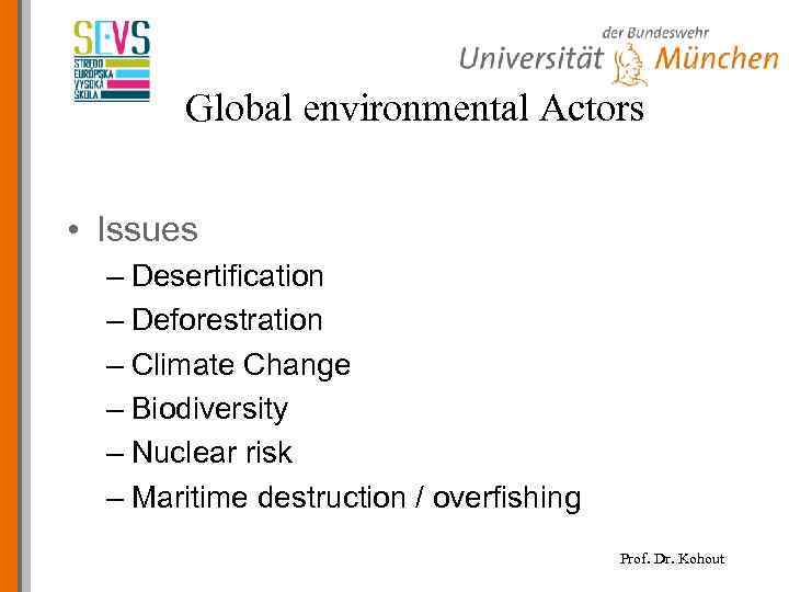 Global environmental Actors • Issues – Desertification – Deforestration – Climate Change – Biodiversity – Nuclear risk – Maritime destruction / overfishing Prof. Dr. Kohout