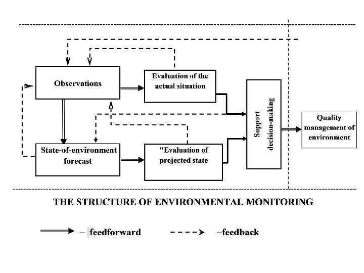 Universal approach for determining the structure of the monitoring system of anthropogenic changes in the environment is its division into basic blocks: "Observations", "Evaluation of the actual situation (current state)", "State-of-environment forecast", "Evaluation of projected state" "Support for decision-making".
