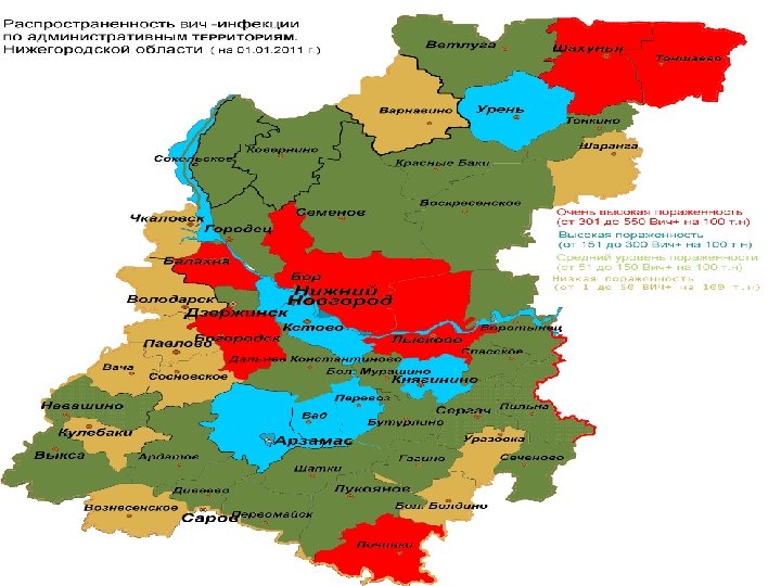 • В эпидемический процесс вовлечены все районы г. Н. Новгорода, все районы области. • Города Арзамас, Дзержинск и Саров. • На 01. 2012 г. к территориям с очень высоким уровнем пораженности ВИЧ относятся 7 районов области – Лысковский (816, 85 на 100 тыс. населения), Шахунский (679, 34), Богородский (478, 98), Тоншаевский (443, 38), Борский (479, 01), Балахнинский (400, 55), Починковский (385, 22). и г. Н. Новгород (375, 74 на 100 тыс. населения)