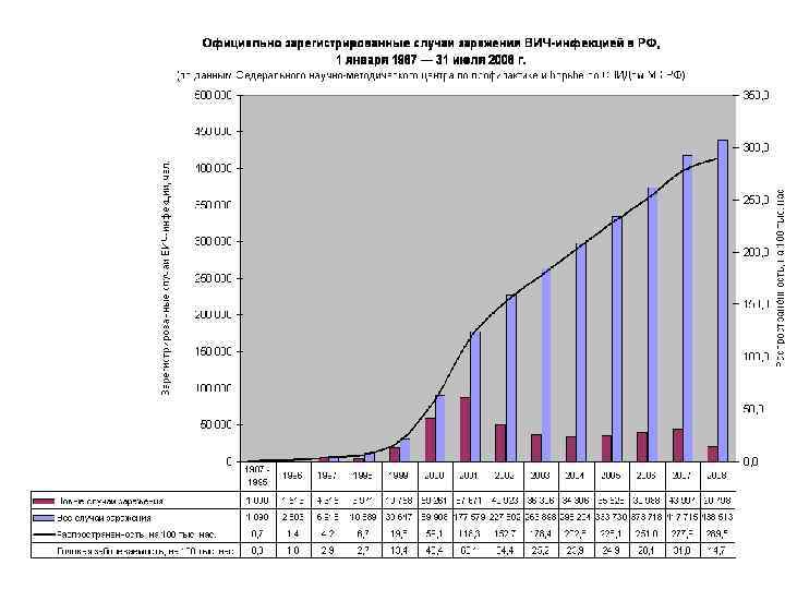 Динамика показателей пораженности и заболеваемости ВИЧ-инфекцией населения Российской Федерации в 1987 - 2008 годах 307, 1 38, 1 0. 6