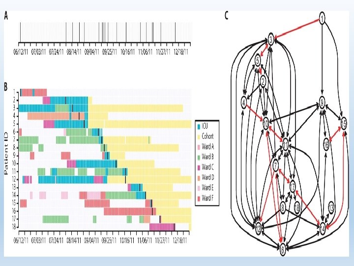 Transmission Map Blue, cluster I; Green, cluster II. Red arrows, opportunity for direct transmission from patients overlapping in the same ward; Black arrows, transmission events that cannot be explained by patient overlap (may result from a more complicated transmission route or an intermediate patient or environmental source); Dashed lines, at least one other transmission link exists leading to the given patient.