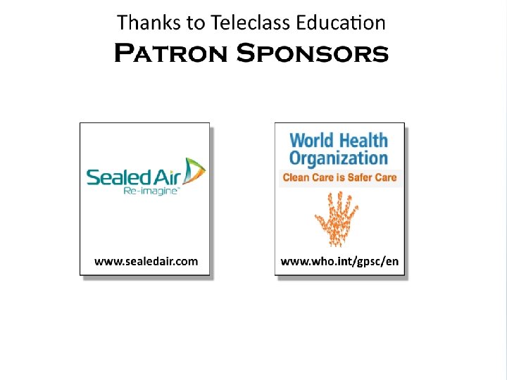 January 28 MRSA IN THE HOSPITAL AND THE COMMUNITY Dr. Geoffrey Taylor, University of Alberta February 17 (Free WHO Teleclass. . . North America) SUCCESSFUL IMPLEMENTATION STRATEGY FOR THE PREVENTION OF SURGICAL SITE INFECTIONS Prof. Sean Berenholtz, Johns Hopkins Schools of Medicine, Baltimore February 24 (South Pacific Teleclass) PATIENT EMPOWERMENT AS PART OF AN ASIAN HAND HYGIENE PROGRAMME Prof. Yee Chun Chen, National Taiwan University Hospital and College of Medicine March 3 MERS-COV: IMPLICATIONS FOR HEALTHCARE FACILITIES Prof. Sotirios Tsiodras, University of Athens Medical School, Greece March 10 (FREE Teleclass) BARRIERS TO TB INFECTION CONTROL IN DEVELOPING COUNTRIES