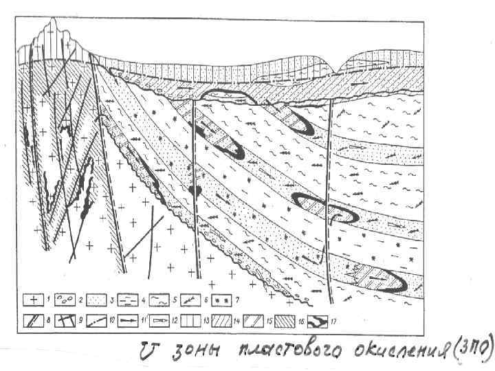 Благоприятные факторы – локальные антиклинальные структуры, осложняющие артезианские бассейны. Экзодиагенетические (инфильтрационные) рудные формации: • 1) медистых сланцев; • 2) медистых песчаников палеорусел пестроцветных толщ; • 3) урановых и битумно-урановых в песчанниках палеорусловых пестроцветных толщ; • 4) урановых и ванадий-урановых в зонах окисления черносланцевых комплексов; •