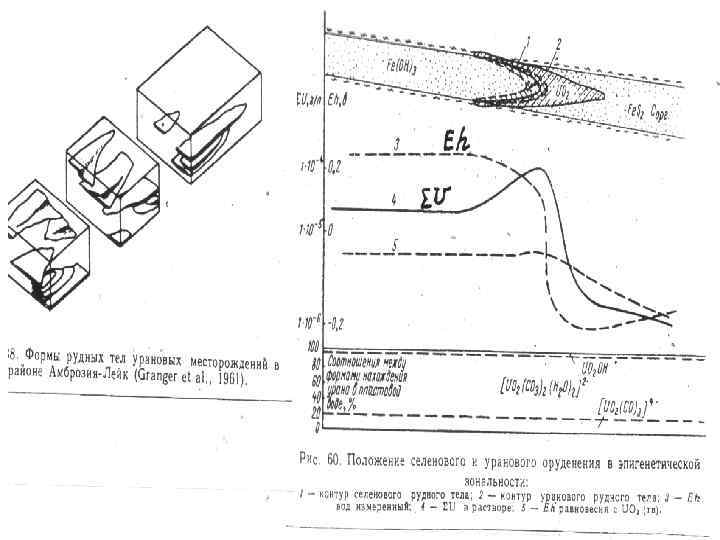 Структура ролла урановых руд (сверху вниз): Зона пластового окисления (тыловая зона, зона окисления) - повышенная конц. кислорода в воде, p. H = 7 -8 U+4 + O 2 + H 2 SO 4 --> U+6 (U 2 SO 4 - неустойчив в воде); Fe+2 --> Fe+3. Подзоны: • 7. полного окисления • 6. неполного окисления • 5. частичного окисления Зона центральная ("мешок") - p. H = 6 (урановая слюдка, торбернит, отенит, карнотит, цейнерит, уранофан, козалит, скупит) U+6 (SO 4) + H 2 S + сульфиды --> U+4 (SO 4)2 + H 2 O --> U+4 (OH)4 Подзоны: • 4. вторичного обогащения (цементации) • 3. бедных ("серых") руд • 2. окисного окисления (урановая смолка) - если много кислорода 1. Зона неизмененная (передовая)