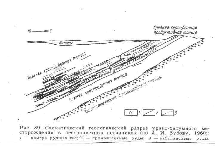 Схема осаждения урана из пластовых вод на участке развития твердых битумов в породах кровли нефтяной залежи 1 – направление движения пластовых вод; 2 – направление миграции нефти по трещинам; 3 – нефтяная залежь; 4 – восходящий источник; 5 – современная поверхность земли, 6 – твердые битумы с ураном; 7 – твердые битумы без урана. Локализация урана (и ряда других элементов) под действием нефтяного органического вещества или его продуктов может совершаться и в породах, никогда не содержавших залежей нефти или углеводородных газов. В некоторых антиклинальных структурах в породах кровли, над нефтяными залежами широко развиты урансодержащие твердые битумы. Предполагается, что битумы возникли в результате микробиологического окисления нефти, которая мигрировала по трещинам, главным образом снизу.