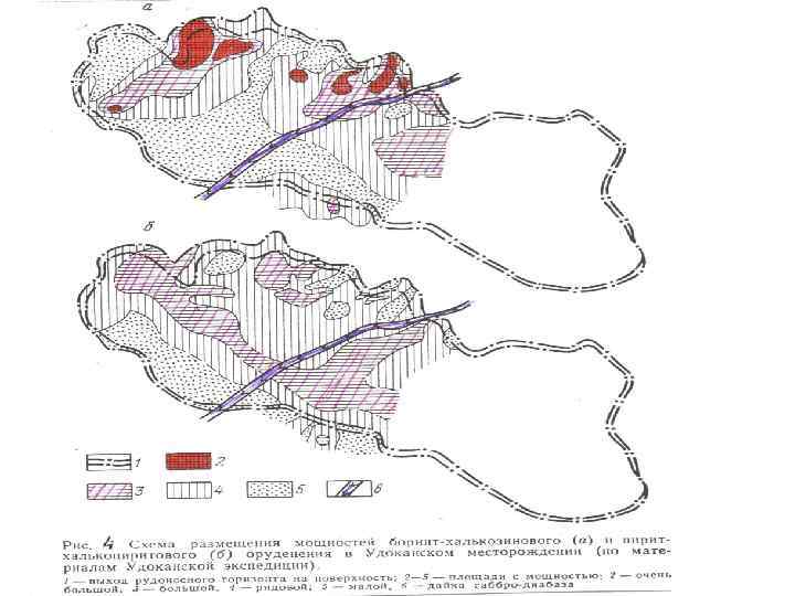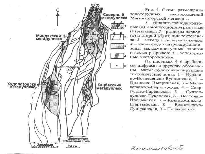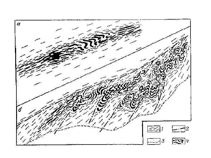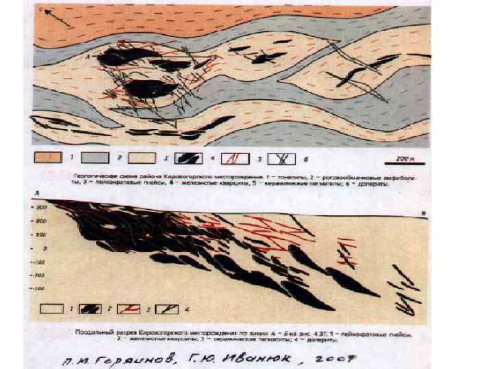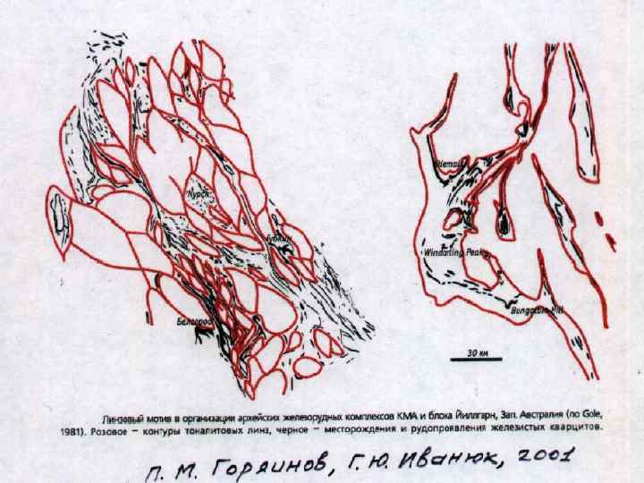 • Основным структурообразующим мотивом в районах развития железистых кварцитов является сочетание овальных блоков тоналитов с полосчатыми железорудными комплексами. В плане линзы железистых кварцитов всегда криволинейны и группируются в компактные зоны субсогластного простирания. Рудный район, поле, месторождение, отдельная залежь или её фрагмент образуют подобный структурный линзовидный узор всё более меньшего размера, зависящего только от масштаба исследования. Основной структурный рисунок рудных проявлений не усложняют и не нарушают ортогональные дизьюнктивы, что не соответствует существующим представлениям о секущем характере поперечных разломов.