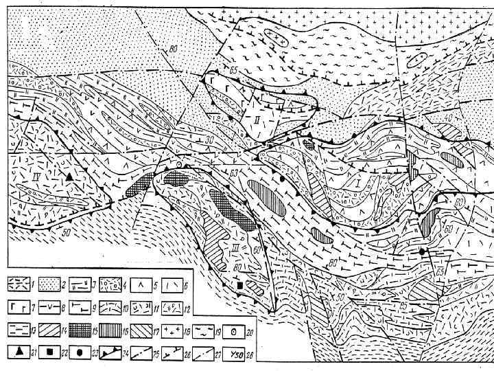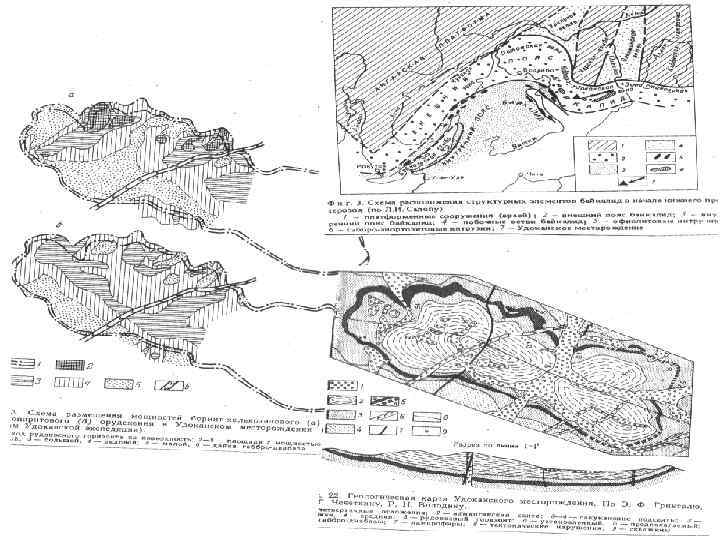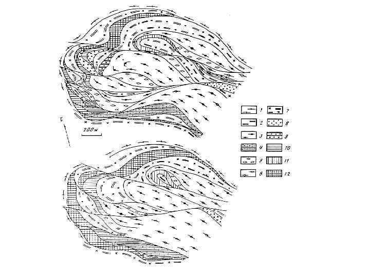 • • В плане линзы железистых кварцитов всегда криволинейны и группируются в компактные зоны субсогластного простирания. • Рудный район, поле, м-ние, отдельная залежь или её фрагмент образуют подобный структурный линзовидный узор всё более меньшего размера, зависящего только от масштаба исследования. Основной структурный рисунок рудных проявлений не усложняют и не нарушают ортогональные дизьюнктивы, что не соответствует существующим представлениям о секущем характере поперечных разломов.