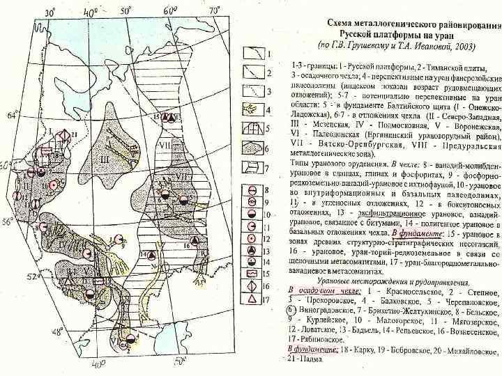 Потенциально ураноносные палеодолины Русской платформы 1 – палеодолины и их возраст, 2 – отдельные месторождения (1 – Брикетно-Желтухинское, 2 – Балковское), 3 – признаки уранового оруднения в фундаменте. Цифры на схеме: 1 – Балтийский щит, 2 – Тимано-Печерская плита 3 – герцинидыуральской складчатой системы, 4 – Скифско-Туранская плита, 5 – Русская платформа, 6 – Воронежский массив.