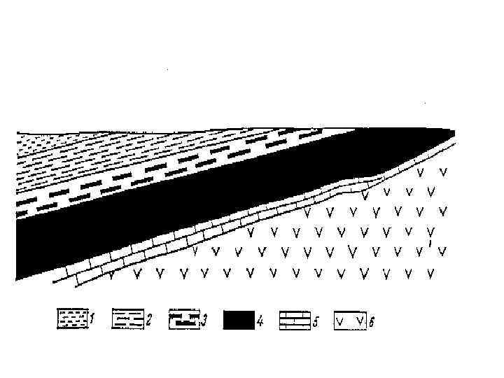 Металлогенограмма для осадочных бассейнов слабоактивизированных частей древних платформ 1 – конгломераты; 2 – пески, песчаники; 3 – алевролиты; 4 – глины; 5 – мергели; 6 – пластоокисленные породы; 7 – урановое оруденение