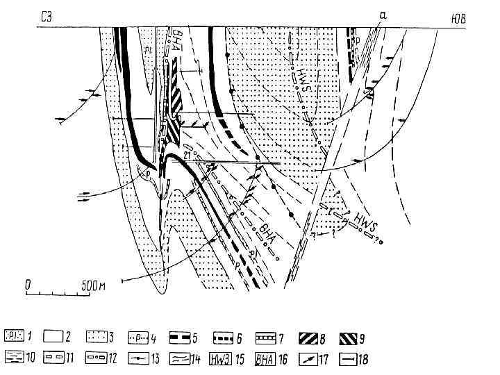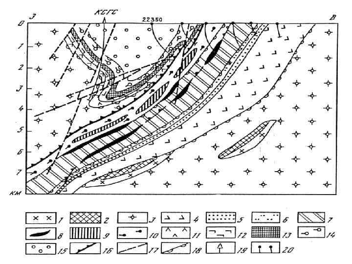 Месторождение Карку. Разрез по третьей рудной зоне. 1 – четвертичные отложения, валунная морена; 2, 3 – рифейские образования, приозерская свита: 2 – верхняя подсвита, базальтовые порфириты, миндалекаменные базальты, лавобрекчии, туфолавы, 3 – нижняя подсвита, песчаники, гравелиты, когломераты; 4, 6 – нижнепротерозойские образования: 4 – биотитовые и гранат-биотитовые гнейсы и сланцы, 5 – графитосодержащие сланцы, 6 – пегматоидные граниты; 7 -9 – участки метосоматического изменения пород; 7 – сульфидно-хлориткарбонатные метосоматиты, 8 – зона выщелоченных пористых черных гравелито-песчаников, 9 – развитие хлорита в гравелитопесчаниках, 10 – интенсивная сульфидизация пород фундамента; 11 – контуры урановых руд: а – бедных и рядовых (более 0, 03%), б- богатых (более 0, 3%); 12 – тектонические нарушения; 13 – скважины, их номер и глубина (м).