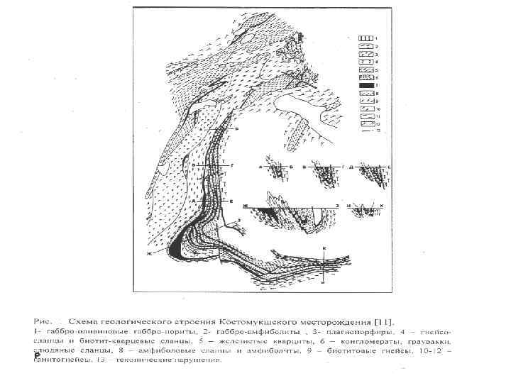 Геолого-структурная схема Ладожской рифтогенной зоны 1 -2 – рифейский вулканогенно-осадочный комплекс: 1 – конгломераты, гравелиты, песчаники, алевролиты, 2 – габбро-долериты, монцо-диориты; 3 – нижнепротерозойские вулканогенно-осадочные комплексы, метаморфизованные до амфиболитовой фации: биотит-амфиболовые гнейсы и сланцы графитизированные; 4 – микроклиновые граниты, гранодиориты (рапакиви); 5 -8 архейские комплексы: 5 – гнейсо-граниты, гранито-гнейсы, гранодиориты, 6 - мигматизированные кристаллические сланцы и гнейсы, 7 – метаморфические и мигматит-плагиогранитные комплексы, 8 – гранат-амфиболовые, гранатская рифтообразующая зона разломов; 11 – месторождение урана Карку; 12 – гидротермальнометасоматические и жильные рудопроявления урана; 13 – гидрогенные месторождения урана в базальтных горизонтах венда; 14 – месторождения урана в диктионемовых сланцах ордовика.