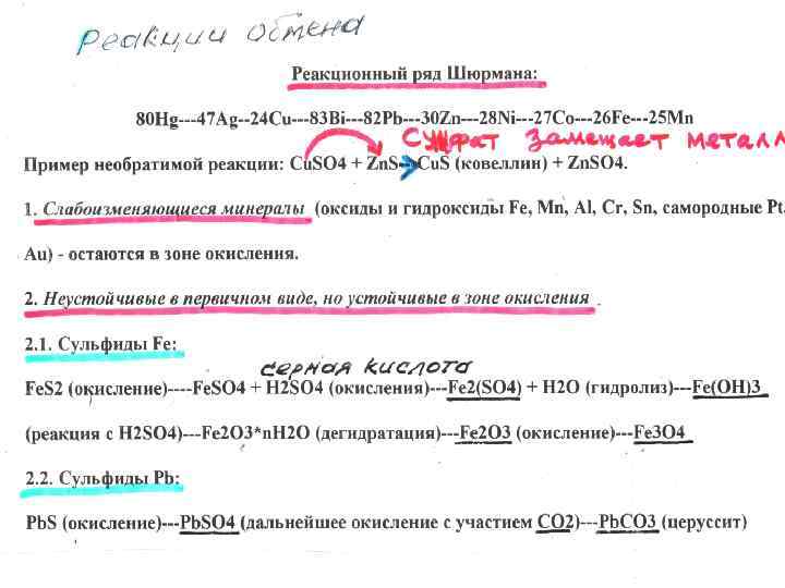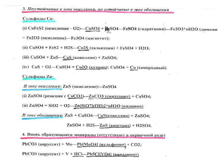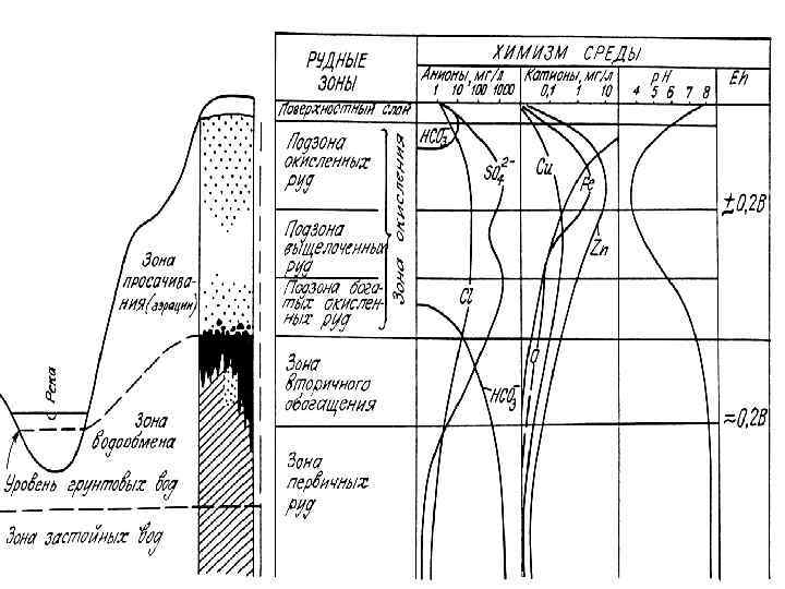 Напомним схему образования зон окисления и вторичного обогащения и, в частности, преобразования грунтовые водами сульфидных руд