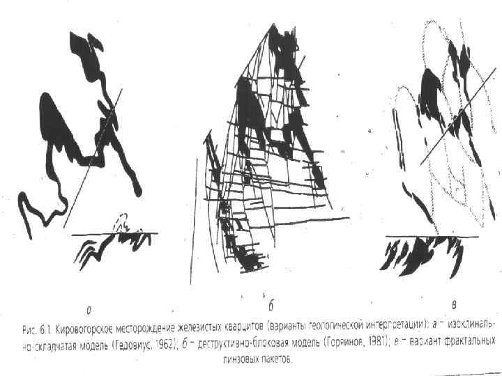 • Действительно, при сопоставлении обнаруживается, что все железорудные месторождения Балтийского щита располагаются вдоль трансформных разломов древней перколяционной сети. При этом в строении месторождений бросается в глаза разномасштабное себеподобие, фрактальность. Так, Кольско-Норвежский мегаблок имеет форму падающей капли. Он включает в себя 12 месторождений железистых кварцитов, того же каплевидного очертания. Фрактал продолжается и на локальном уровне. Все 12 линзовидных месторождений имеют симметрично-зональное строение. При расчленении пачки железорудного тела на более мелкие тела исходный порядок всегда сохраняется.