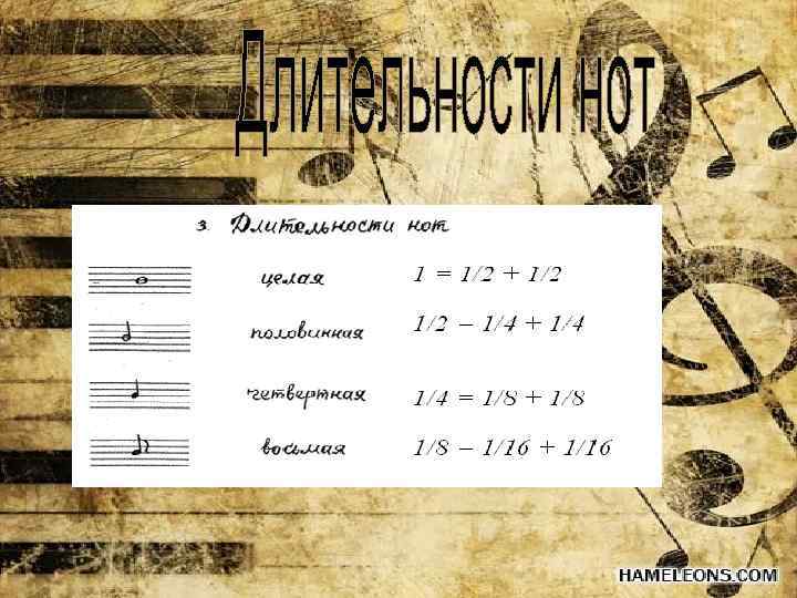 В самом низу нотного дерева изображена целая нота(1), выше ½, ещё выше ¼, на третьем уровне 1/8, а на самом вверху 1/16.