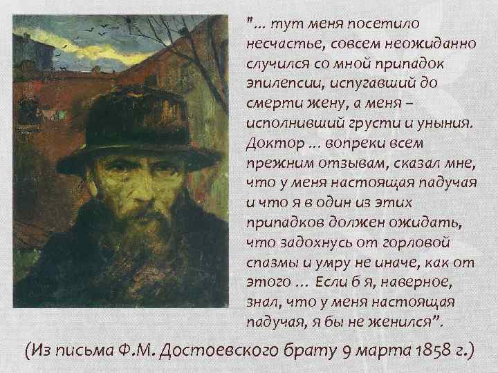 ". . . тут меня посетило несчастье, совсем неожиданно случился со мной припадок эпилепсии, испугавший до смерти жену, а меня – исполнивший грусти и уныния. Доктор. . . вопреки всем прежним отзывам, сказал мне, что у меня настоящая падучая и что я в один из этих припадков должен ожидать, что задохнусь от горловой спазмы и умру не иначе, как от этого … Если б я, наверное, знал, что у меня настоящая падучая, я бы не женился”. (Из письма Ф. М. Достоевского брату 9 марта 1858 г. )