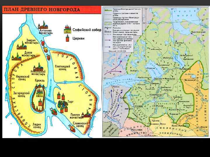 ОСОБЕННОСТИ НОВГОРОДСКОЙ ЗЕМЛИ 1136 г. – Изгнание Всеволода Мстиславича из-за трусости: начало самостоятельности (до 1478); Князья больше не назначались Киевом, а приглашались по решению Вече; Ведущие отрасли – торговля, ремесло, промыслы, но слаборазвитое земледелие; Республиканское политическое устройство: • Вече – собрание мужского населения, решавшее вопросы по призванию, суду, отстранению князя, избранию посадника, тысяцкого и владыки, объявляло войны и заключало мирные договоры, издавало законы и назначало наместников в своих землях; • Князь – приглашённый представитель династии Рюриковичей из других княжеств. Обладал функциями гражданского суда, управлял обороной города и был главным военачальником в случае войны. • Посадник – председатель народного вече, обладавший исполнительной властью. Руководил всеми чиновниками и ставленниками в землях, подчинялся вече и боярскому совету. • Тысяцкий – предводитель новгородского ополчения, собиравший налоги и вершивший торговый суд. • Владыка (Архиепископ) - верховные священник, хранитель государственной казны, контролировал эталоны мер и весов.