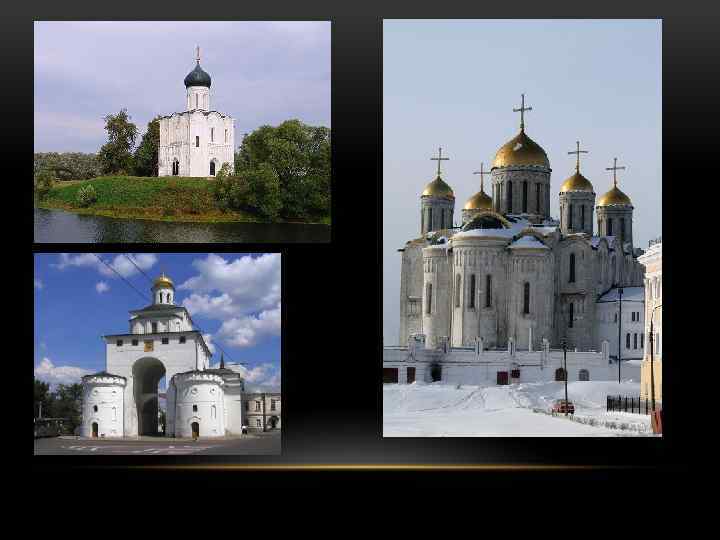 ЛИЧНОСТИ • Юрий Долгорукий – князь Ростово-Суздальский (1013 -1149/11511157), великий князь Киевский (1149 -1151/1155 -1157), самый младший сын Владимира Мономаха. В 1125 г. перенёс столицу из Ростова в Суздаль. Основал Юрьев-Польский, Дмитров, Звенигород, заложил Московский кремль. Боролся за Киевский стол, с боярством, ими и был отравлен. • Андрей Боголюбский – великий князь Владимирский (1157 -1174). Был при отце в Киеве, но переехал в 1155 во Владимир с иконой Богородицы. Перенёс столицу во Владимир. Построил Успенский собор, Покрова на Нерли, Боголюбово, Золотые Ворота. В 1169 г. захватил и разграбил Киев, посадил там младшего брата. Опирался не на боярство, а на рядовых дружинников, усилил самовластие князя – боярский заговор 1174 г; • Всеволод Большое Гнездо – великий князь Киевский (1173), великий князь Владимирский (1176 -1212). Продолжил политику предшественников, опирался на новые города, где было слабое боярство. Перестроил Успенский собор. Боролся с половцами и Волжской Булгарией. Был уважаем среди других князей.