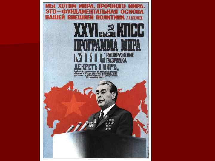n Конец 60 -х – конец 70 -х гг. называют периодом разрядки международной напряженности. В это время происходит заметное потепление российско-американских отношений. В 1973 году во время посещения с официальным визитом США Брежнев даже заявляет о том, что "холодная война" закончена.