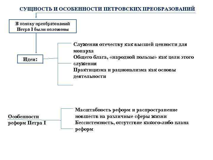 СУЩНОСТЬ И ОСОБЕННОСТИ ПЕТРОВСКИХ ПРЕОБРАЗОВАНИЙ В основу преобразований Петра I были положены Идеи: Особенности реформ Петра I Служения отечеству как высшей ценности для монарха Общего блага, «народной пользы» как цели этого служения Практицизма и рационализма как основы деятельности Масштабность реформ и распространение новшеств на различные сферы жизни Бессистемность, отсутствие какого-либо плана реформ