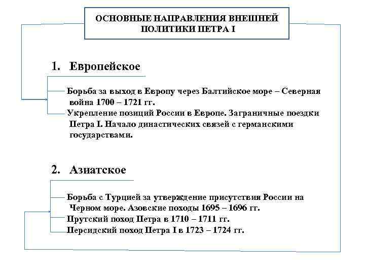 ОСНОВНЫЕ НАПРАВЛЕНИЯ ВНЕШНЕЙ ПОЛИТИКИ ПЕТРА I 1. Европейское Борьба за выход в Европу через Балтийское море – Северная война 1700 – 1721 гг. Укрепление позиций России в Европе. Заграничные поездки Петра I. Начало династических связей с германскими государствами. 2. Азиатское Борьба с Турцией за утверждение присутствия России на Черном море. Азовские походы 1695 – 1696 гг. Прутский поход Петра в 1710 – 1711 гг. Персидский поход Петра I в 1723 – 1724 гг.