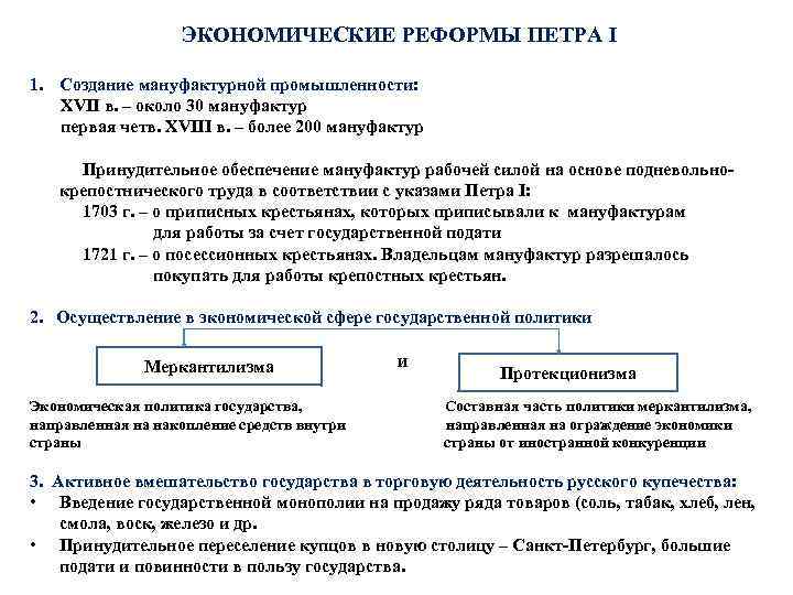 ЭКОНОМИЧЕСКИЕ РЕФОРМЫ ПЕТРА I 1. Создание мануфактурной промышленности: XVII в. – около 30 мануфактур первая четв. XVIII в. – более 200 мануфактур Принудительное обеспечение мануфактур рабочей силой на основе подневольнокрепостнического труда в соответствии с указами Петра I: 1703 г. – о приписных крестьянах, которых приписывали к мануфактурам для работы за счет государственной подати 1721 г. – о посессионных крестьянах. Владельцам мануфактур разрешалось покупать для работы крепостных крестьян. 2. Осуществление в экономической сфере государственной политики и Меркантилизма Протекционизма Экономическая политика государства, Составная часть политики меркантилизма, направленная на накопление средств внутри направленная на ограждение экономики страны страны от иностранной конкуренции 3. Активное вмешательство государства в торговую деятельность русского купечества: • Введение государственной монополии на продажу ряда товаров (соль, табак, хлеб, лен, смола, воск, железо и др. • Принудительное переселение купцов в новую столицу – Санкт-Петербург, большие подати и повинности в пользу государства.