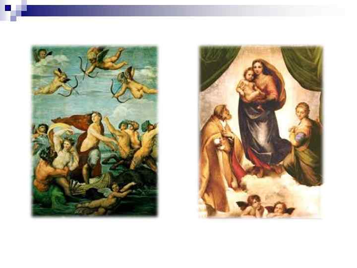 Изобразительное искусство n В творчестве Леонардо да Винчи, Рафаэля, Тициана итальянская живопись достигла своего наивысшего рассвета. Созданные ими образы воплощали человеческое достоинство, силу, мудрость, красоту Рафаэль. Мадонна с младенцем.