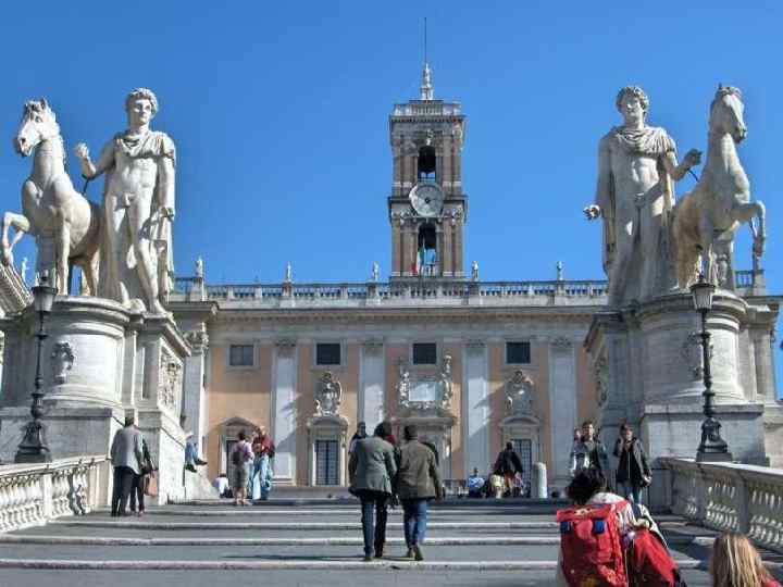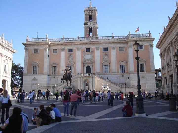 Площадь Капитолия в Риме. XVI —XVII вв. • В центре площади, вымощенной по эскизу Микеланджело, установлена античная конная статуя римского императора Марка Аврелия (II в. ). • Ансамбль завершает Дворец сенаторов — внушительное массивное здание с башней и монументальной лестницей. Здание было построено в XII в. Достраивался дворец уже после смерти зодчего. В настоящее время здесь располагается ратуша.
