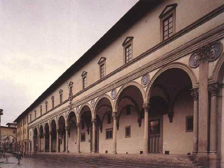 Оспедале дельи Инноченти во Флоренции (Воспитательный дом) 1421— 44 • Это первое в истории ренессансного гражданского зодчества здание детского приюта. • Двухэтажный фасад здания протянулся вдоль одной из сторон площади. Его нижний этаж открывается девятью аркадами на стройных изящных колоннах. Невысокая лестница, протянувшаяся почти во всю ширину фасада, словно приглашает вступить под своды аркад.