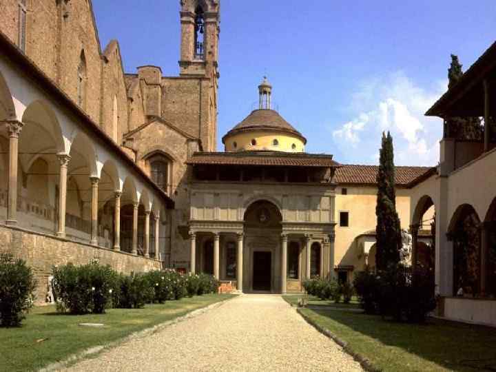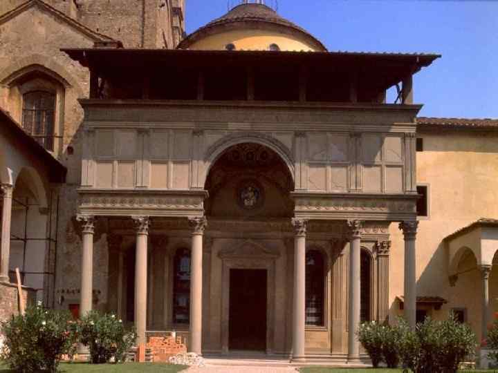 Капелла Пацци во Флоренции Начата в 1429 Монастырь Санта-Кроче, Флоренция • Капелла Пацци — подлинная жемчужина Раннего Возрождения. Капелла была создана по заказу богатого флорентийского семейства Пацци. Небольшое прямоугольное в плане здание располагается в глубине узкого двора церкви Санта-Кроче. Фасад капеллы открывается во двор шестиколонным портиком с большим арочным проемом в центре.