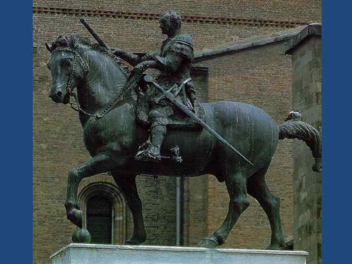 Конный памятник кондотьеру Гаттамелате 1447— 53 Бронза, мрамор, известняк. Высота 340 см Пьяцца дель Санто, Падуя • Уроженец Падуи, Эразмо де Нарни находился на службе у Венецианской республики. Итальянцы прозвали его Гаттамелатой (Хитрой Кошкой). Заслуги Гаттамелаты были столь велики, что венецианский совет разрешил поставить ему памятник.