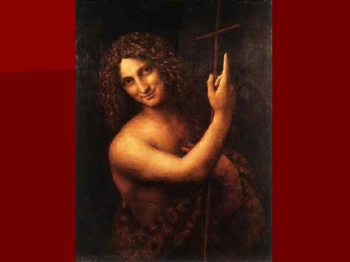 n Иоан Креститель. Картина художника Леонардо да Винчи «Иоанн Креститель» . Размер картины 69 x 57 см, дерево, масло. Картина «Иоанн Креститель» может служить свидетельством того, что Леонардо да Винчи опередил своих современников не только на пути становления искусства Высокого Возрождения, но и в предчувствии его вскоре наступившего кризиса. На картине художником изображен длиннокудрый женоподобный юноша, который в одной руке держит крест, а другой указывает на небо, по самой своей идее, по характеру образа и по монохромной живописи (обращает на себя внимание глухая светотень и темный, почти черный фон) находится в противоречии с духом предшествующего искусства Леонардо да Винчи. Особенности этой картины трудно рассматривать только как результат творческого упадка самого художника — в ней уже зарождаются качества, внутренне родственные кризисным явлениям, обнаружившимся в итальянском ренессансном искусстве во всей своей силе через полтора-два десятилетия.